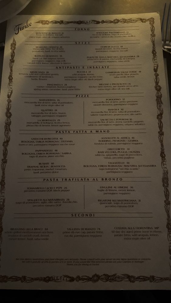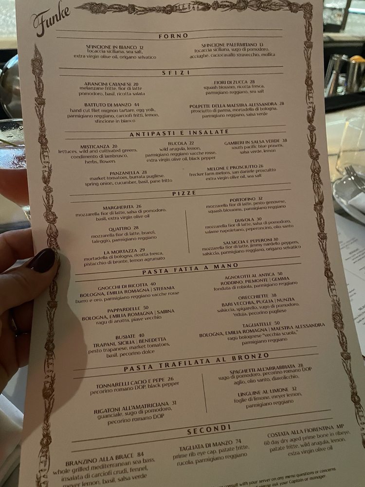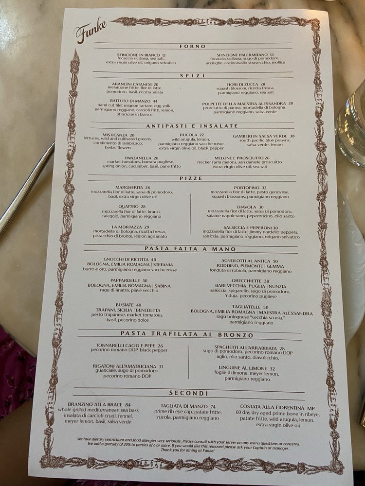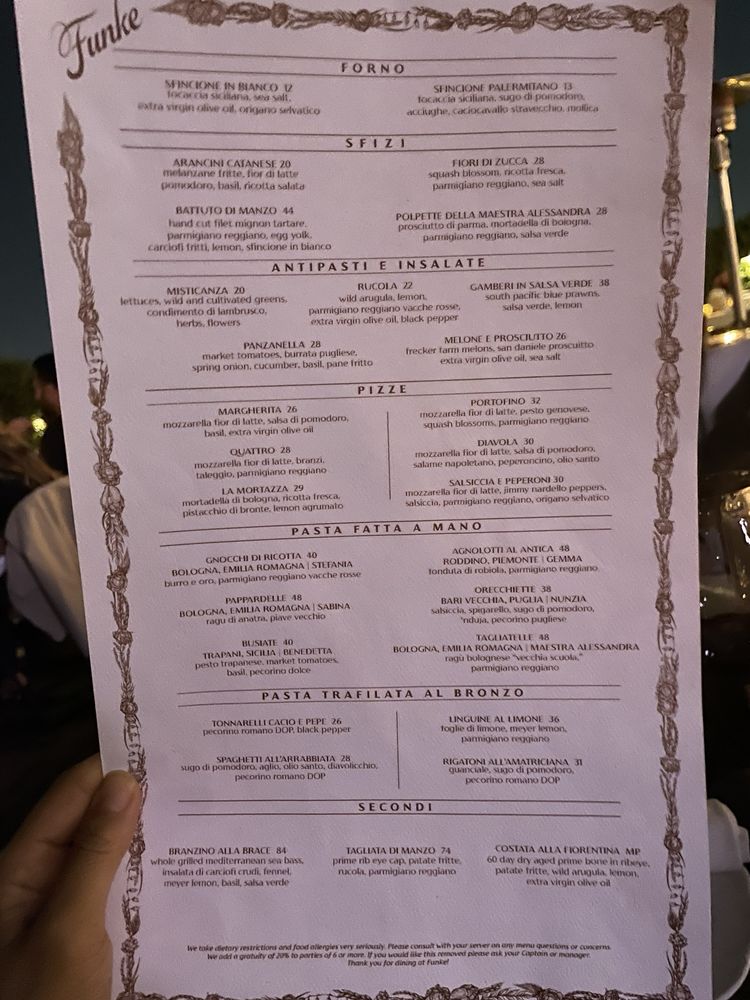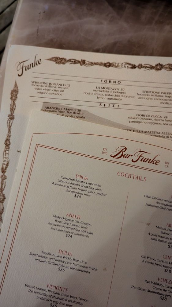 Funke, located in Beverly Hills, is a trendy Italian bar known for its upscale ambiance and innovative menu offerings. With a focus on sustainability, Funke provides plastic-free packaging and reusable tableware. The menu features a variety of pizza options like the unique Lemon Pizza and classic Margherita, along with handmade pasta dishes such as Tagliatelle and Gnocchi Di Ricotta. Customer reviews highlight favorites like the Squash Blossoms, Focaccia, and Sea Bass, praising the attentive service and lively atmosphere. The rooftop bar adds to the overall experience, offering a relaxed setting to enjoy dishes like the Amalfi pizza and perfectly cooked Branzino. Funke strikes a balance between upscale dining and comforting flavors, making it a must-visit spot in the Beverly Hills area.